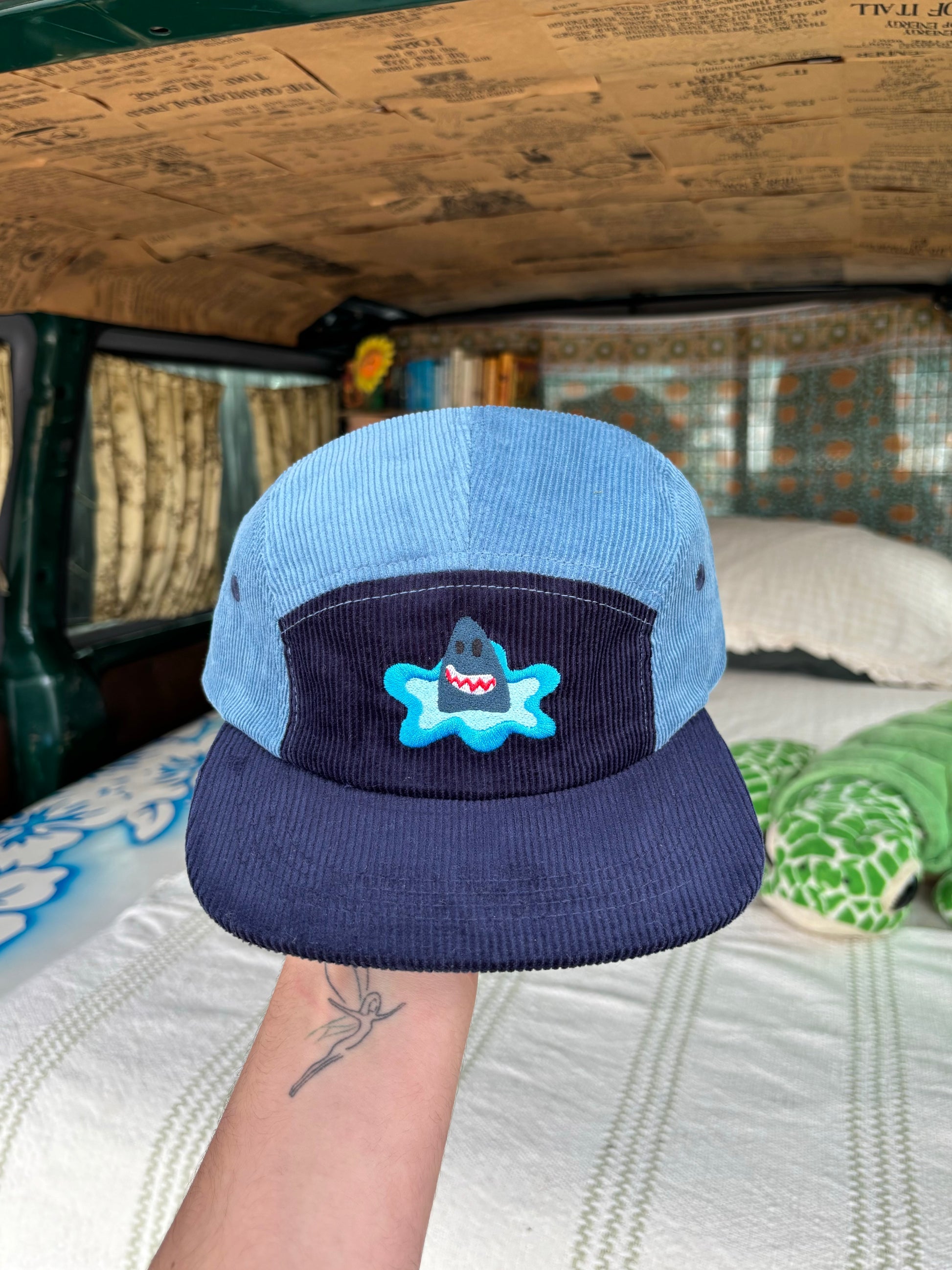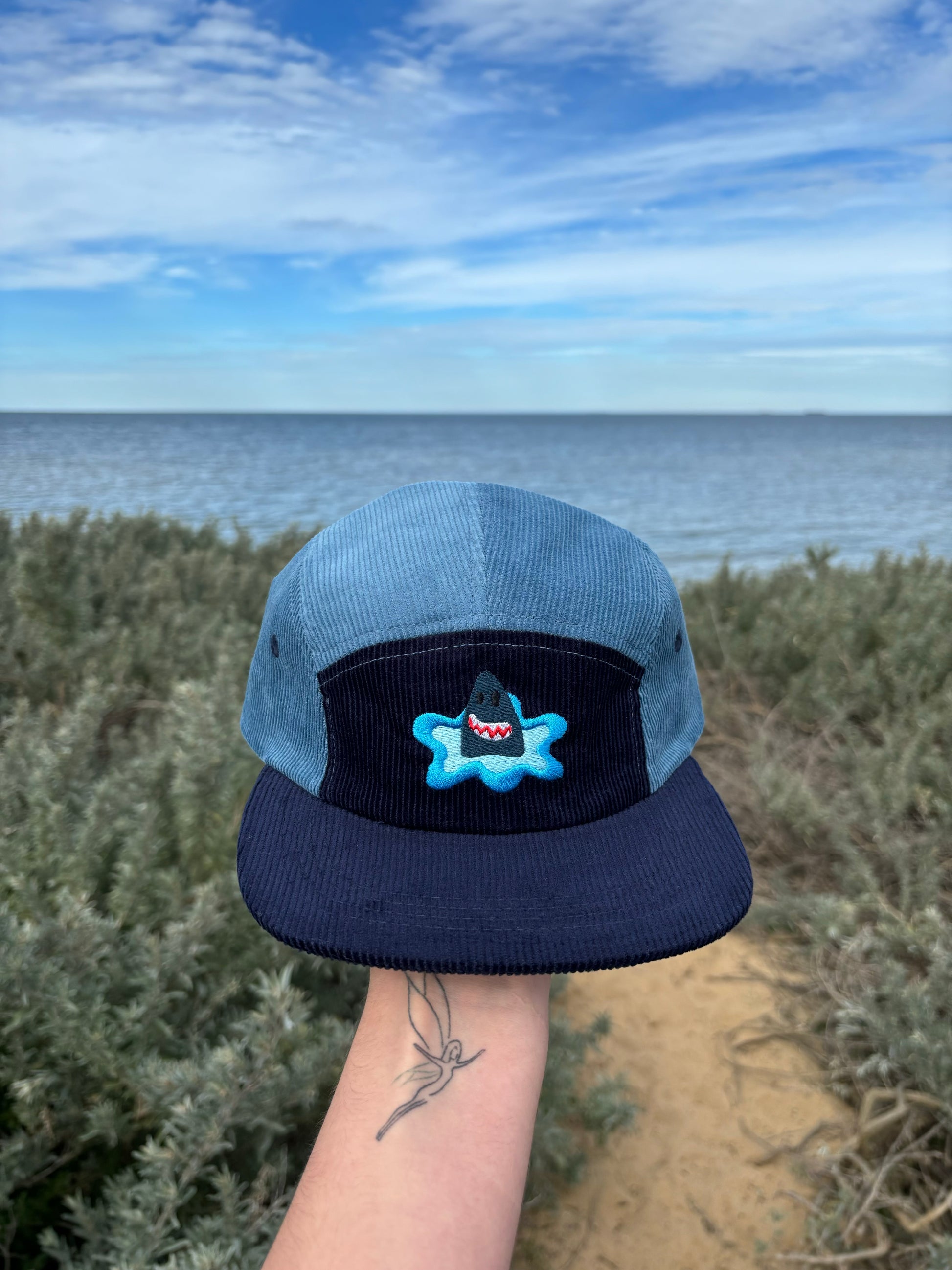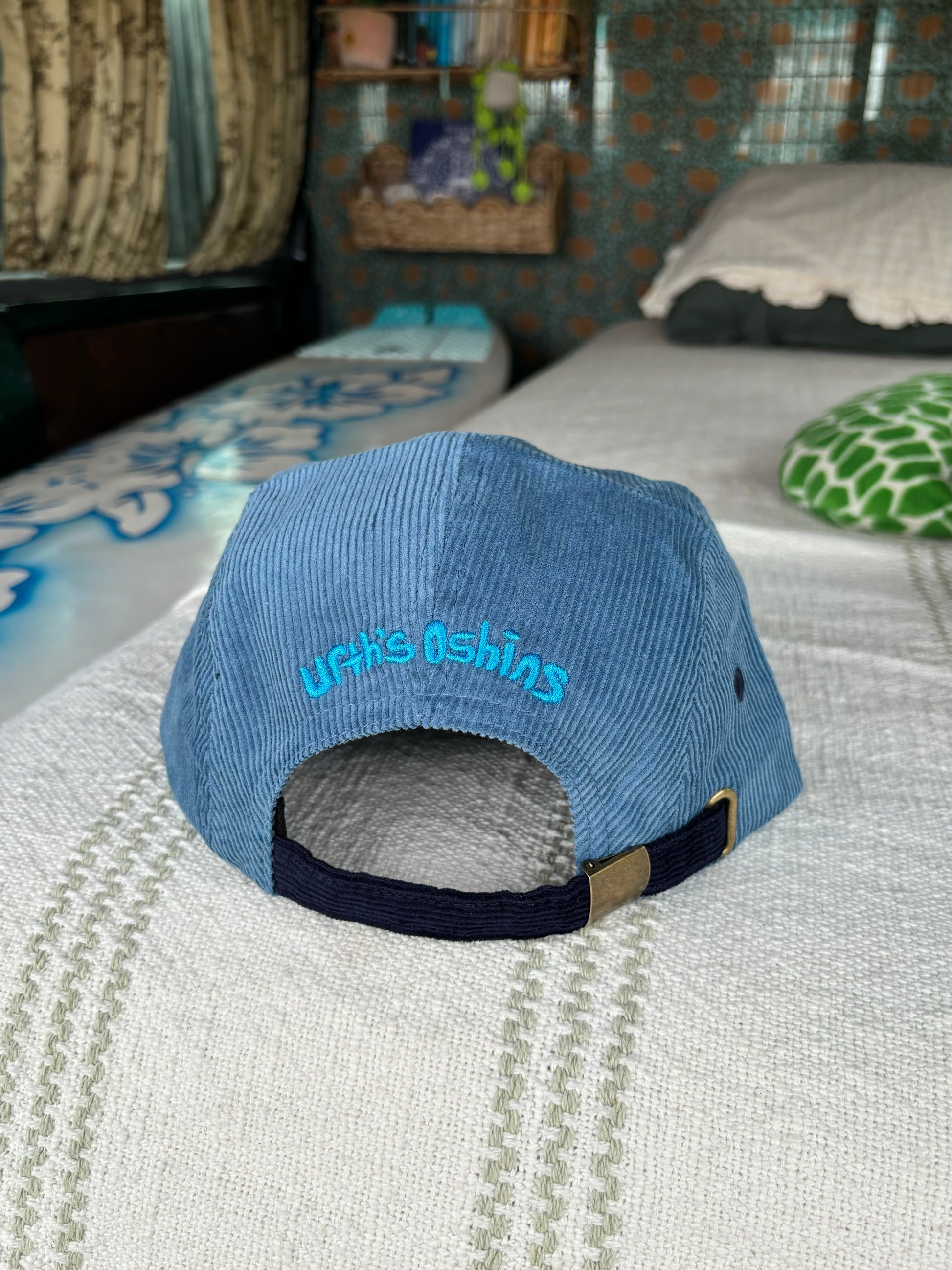 5 panel unstructured lid, made of dual-toned blue corduroy. Featuring embroidery on the front and back panels, with an adjustable back strap + copper-coloured clasp.