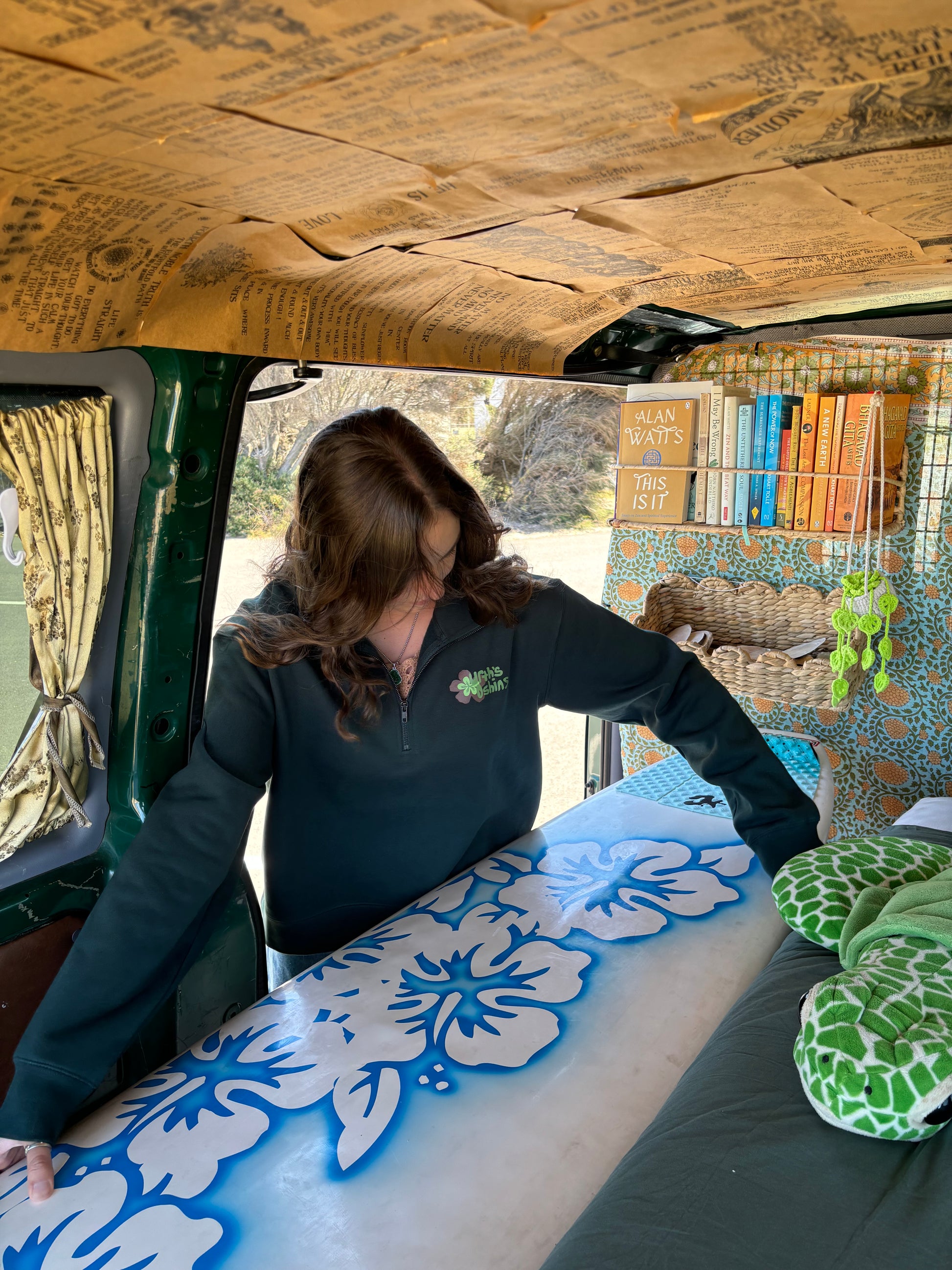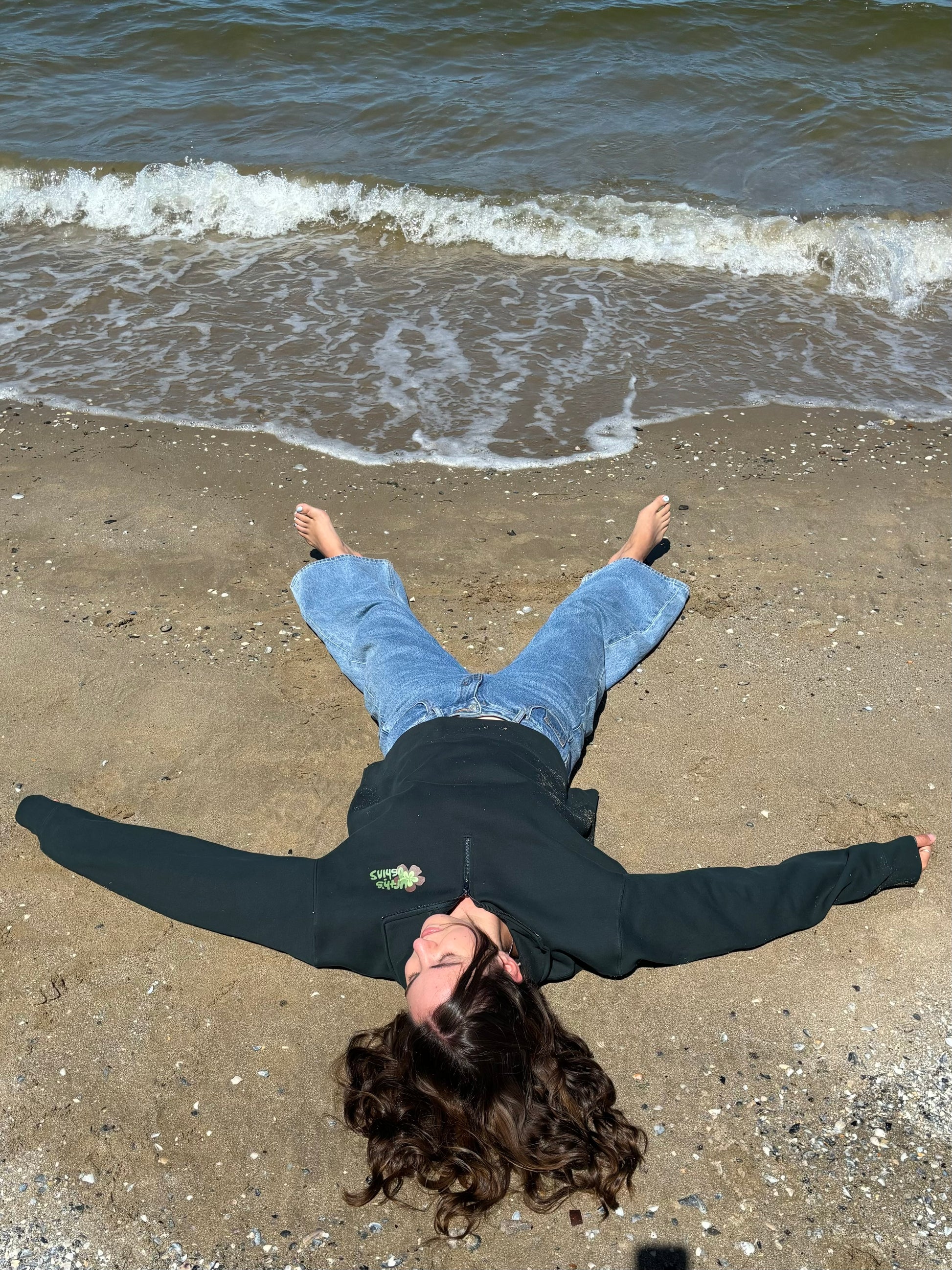 Heavyweight, relaxed fit quarter zip in forest green, featuring the Urth’s Oshins ‘Flowa’ graphic on the left chest. Slightly cropped length, with extra long sleeves.