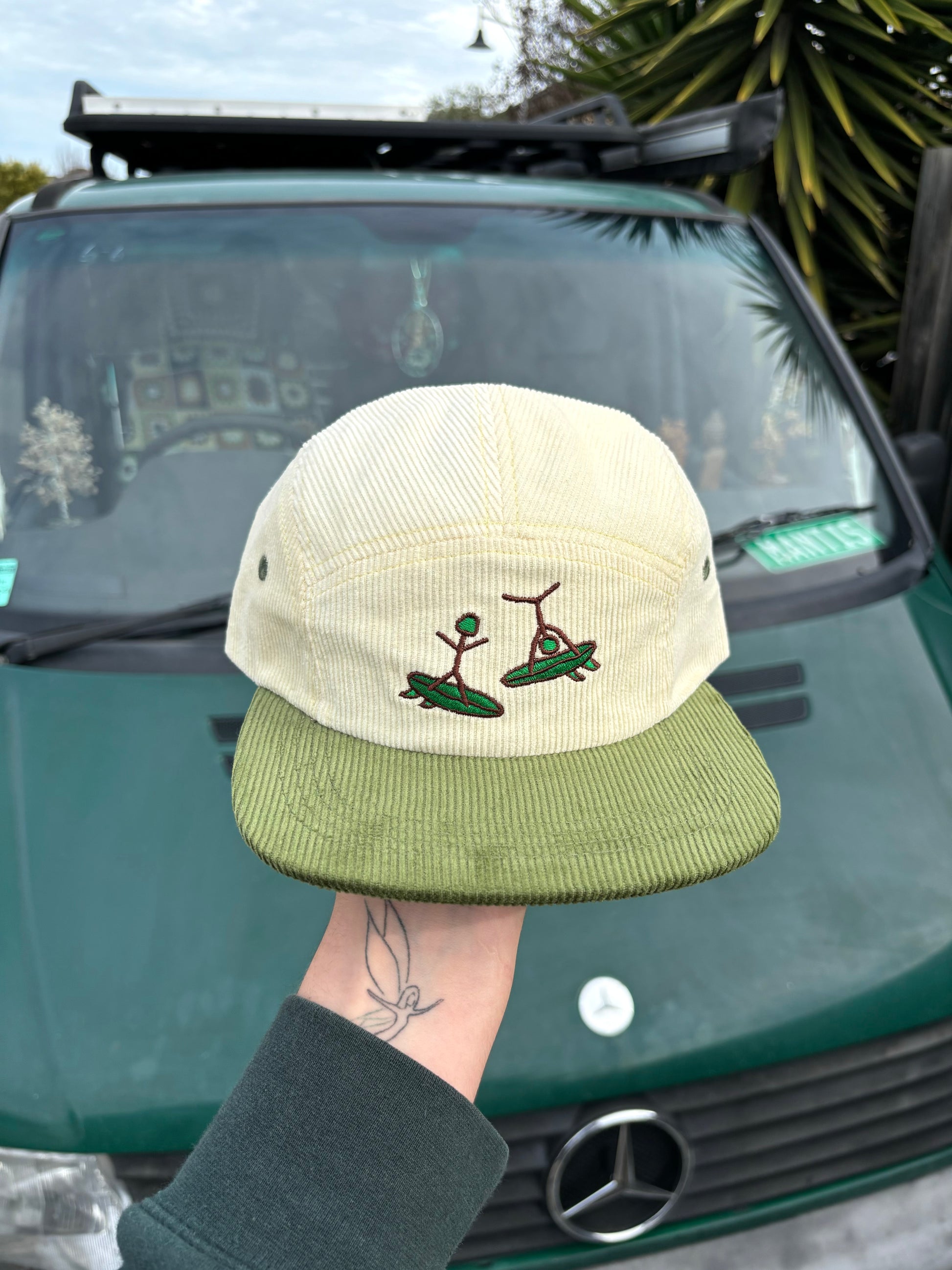 5 panel unstructured lid, made of green and butter corduroy. Featuring embroidery on the front and back panels, with an adjustable back strap + copper-coloured clasp.